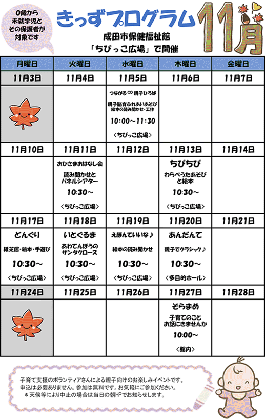 | 42 | × | 29 | どんぐり | 保健福祉館のちびっこ広場で「きっずプログラム」に参加。手遊び歌、親子工作など。 | 6 | × |